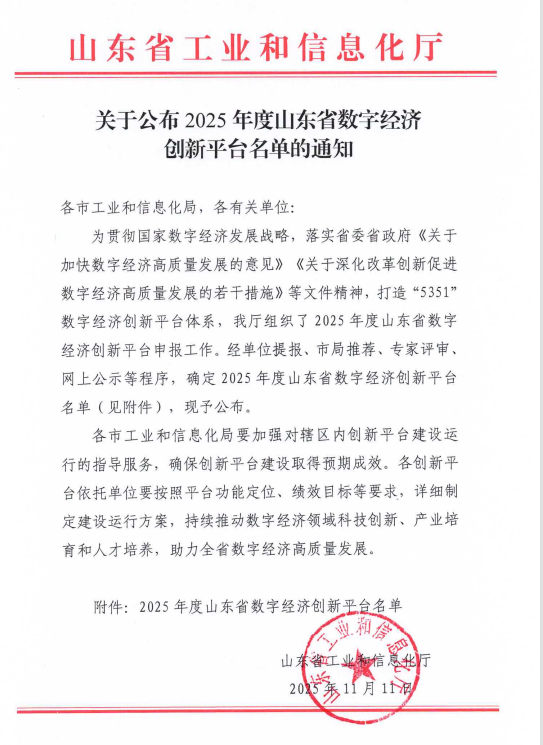 近日,山东省工业和信息化厅发布了《关于公布2025年度山东省数字经济创新平台名单的通知》,信息工程学院凭借在数字经济领域人才培养的深厚积淀与创新实践,成功入选数字经济创新人才实训基地。