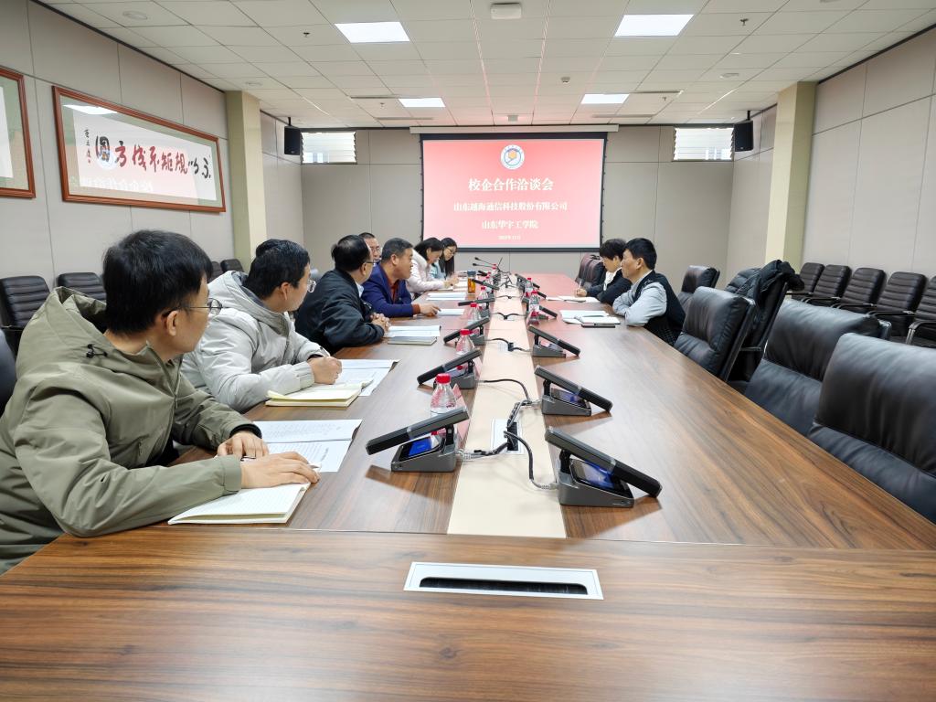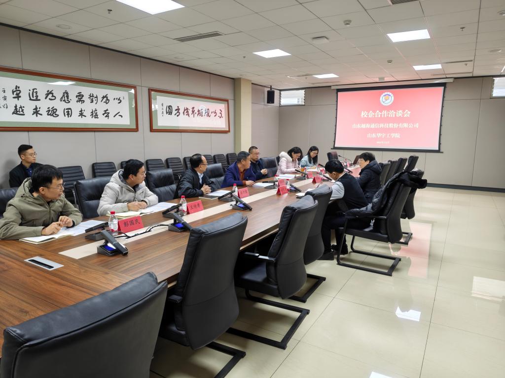 2025年12月9日上午9:30,山东越海通信科技股份有限公司与山东华宇工学院在学校行政楼906会议室召开校企合作洽谈会议。双方围绕校企协同创新、项目联合申报、资源优势互补等核心议题深入磋商,达成高度共识。山东越海通信科技股份有限公司孙明勇、陈淑新,山东华宇工学院魏东坡、薛河儒、李海涛以及合作发展处、科研处、信息工程学院等相关工作人员出席会议。